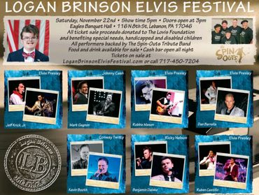 * Nov. 22, 2025 [Sat.] LOGAN BRINSON ELVIS FESTIVAL! Eagles Banquet Hall, 116 North 8th Street, Lebanon, PA. Tickets on sale at: LoganBrinsonElvisFestival.com or call 717-450-7204. You won't want to miss this incredible show! https://loganbrinsonelvisfestival.com/