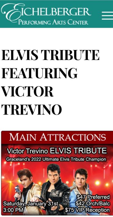 * Jan. 31, 2026 [Sat.] Eichelberger Performing Arts Center, Hanover, PA. https://theeich.org/ovationtix_series/elvis-tribute-featuring-victor-trevino-2/