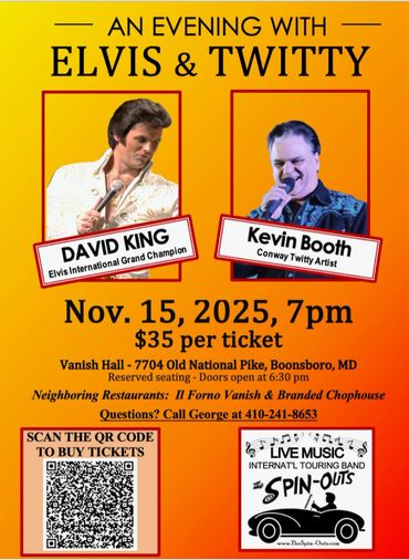 * Nov. 15, 2025 [Sat.] with David King performing Elvis' most memorable songs and special guest Kevin Booth performing Conway Twitty's greatest hits!. Vanish Hall, Boonsboro, MD. This event is likely to sell-out! https://www.eventbrite.com/e/an-evening-with-elvis-twitty-tickets-1704576366799